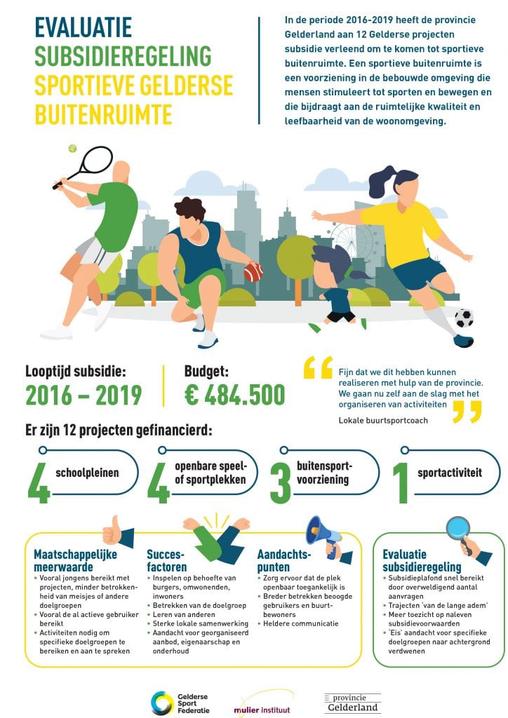 De nieuwe Omgevingswet biedt mogelijkheden om bij het inrichten van de leefomgeving aandacht te schenken aan gezonde leefstijl en leefbaarheid. In het Gelders Sportakkoord en het uitvoeringsprogramma Gelderland Sport! van de provincie Gelderland is nadrukkelijk aandacht voor de sportieve inrichting van de openbare ruimte. Zo heeft de provincie aan twaalf Gelderse projecten subsidie verleend om de openbare ruimte sportvriendelijker en leefbaarder te maken. In dit onderzoek is van alle twaalf projecten in kaart gebracht hoe de organisatie, het beheer en het activiteitenaanbod op elkaar zijn afgestemd en wat daarin succes- en faalfactoren waren.
